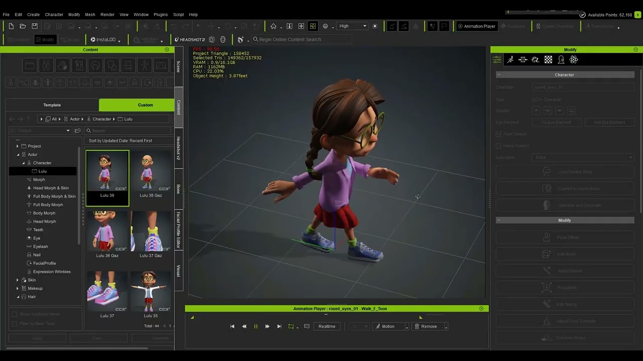 This is an animation walk test for Lulu. I love the movement in her pigtails. I love her shoes. Shes definitely progressing nicely now, but still has a fair bit of work to be done.