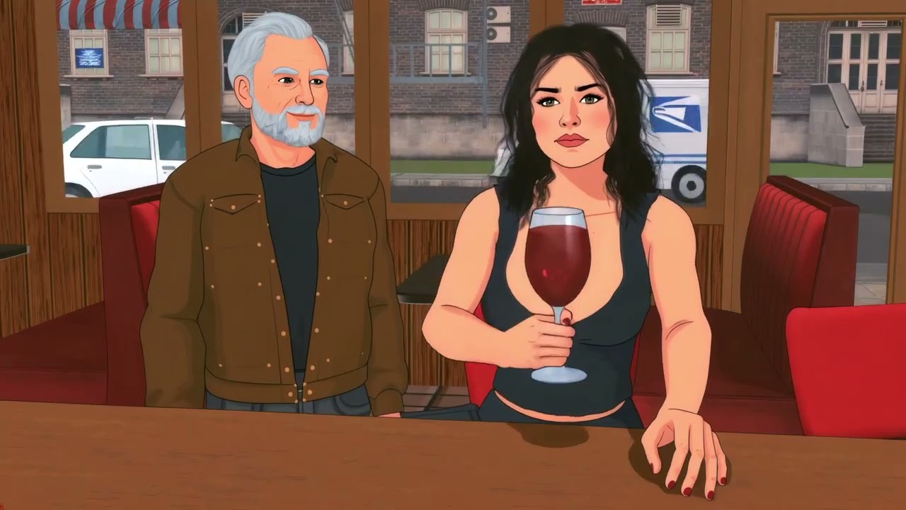 Meanwhile, the woman brings the rim of the glass to her lips, tilts the glass so the wine touches her lips and then takes a sip from the wine.