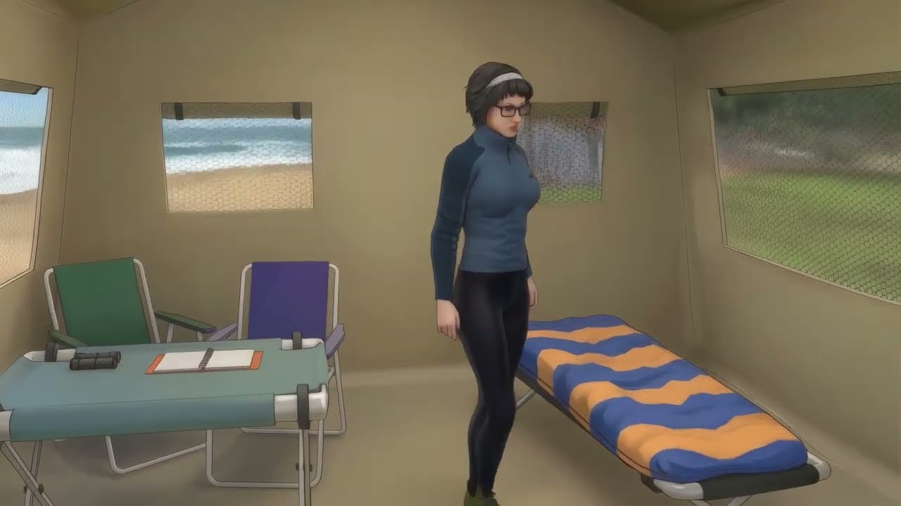 The scene below shows a young woman sitting at a worktable in her large tent. She is reading a notebook, but she is tired, so she gets up to have a lie-down.