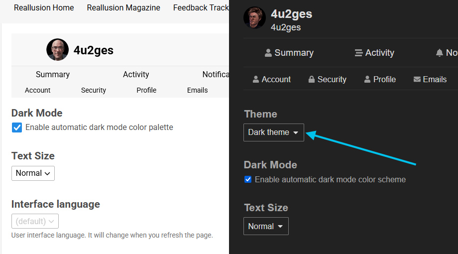 RL admins removed a Theme selector and forced “Enable automatic dark mode color palette” to everyone from the back end (I am saying that because that check box value cannot be changed and Saved right now).