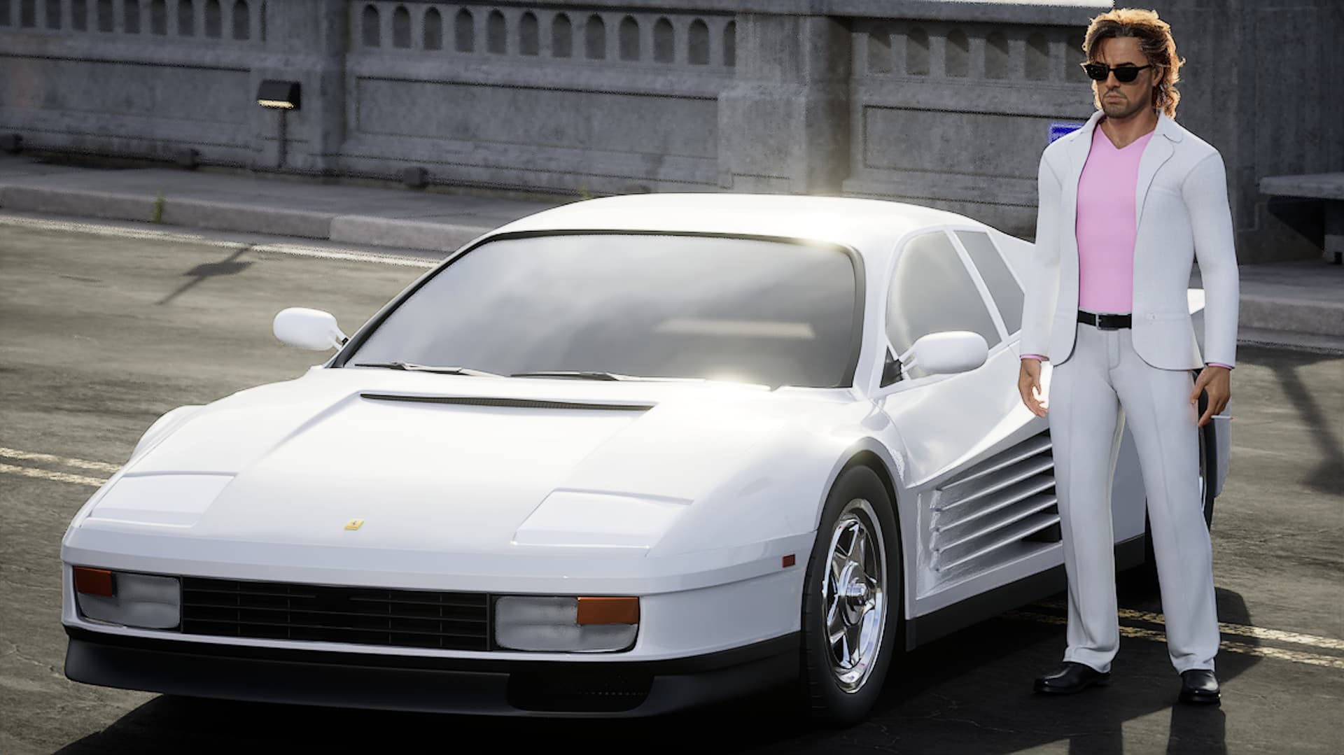 I have always wanted to remake the old school video game OutRun from when I was a kid, but I wanted to make some fundamental changes. For example, the hero drives a red, convertible Ferrari Testarossa and in my opinion, there is just ONE iconic character from the 1980s that drove a Testarossa, so I fired up the ole’ CC5 and Blender and got busy. Here are the results…