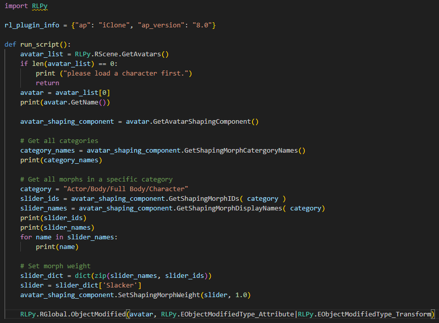 I’d like to modify morphs using a Python script directly inside Character Creator 5, but I haven’t been able to find any documentation on how to control morph settings through Python. Can anyone help or point me in the right direction?