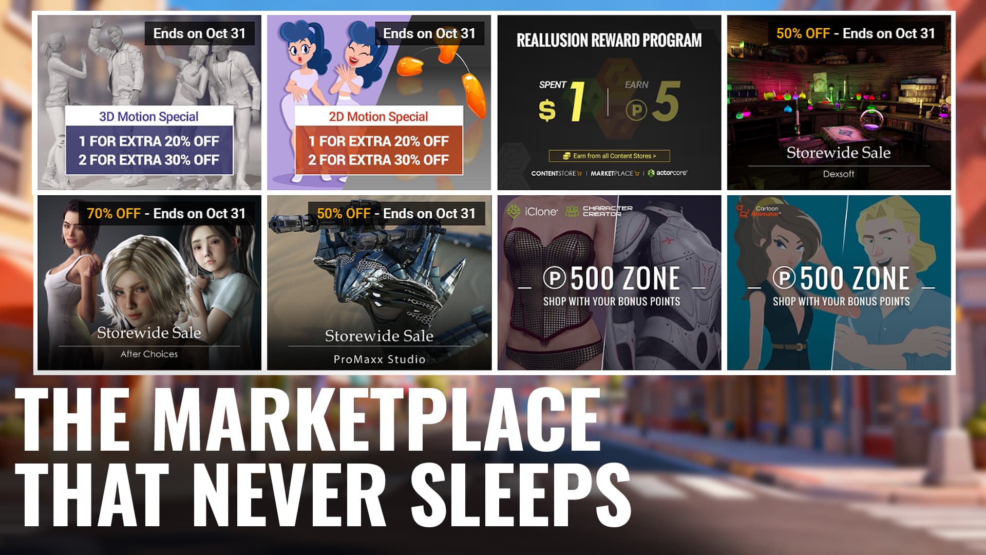 Thanks to the Reallusion Marketplace, inspiration is never far. Characters, props, scenes, motions, and effects to bring your worlds to life. Everything you need to create is waiting right here for you.